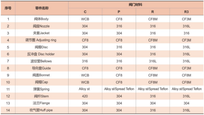 保溫夾套安全閥零件材料: