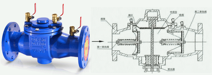 2、當(dāng)進(jìn)水口壓力與泄水閥腔的壓力差小于0 02Mpa時(shí),介質(zhì)處于倒流的臨界狀態(tài),這時(shí)泄水閥膜片上部壓力小于泄水閥腔和彈簧的壓力,泄水閥自動(dòng)開啟,將倒流介質(zhì)排出管外,同時(shí)大量空氣進(jìn)入閥腔,形成空氣隔斷.杜絕介質(zhì)倒流,大于0 02Mpa時(shí)泄水閥自動(dòng)關(guān)閉。