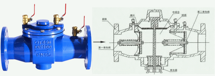 2、當(dāng)進(jìn)水口壓力與泄水閥腔的壓力差小于0 02Mpa時,介質(zhì)處于倒流的臨界狀態(tài),這時泄水閥膜片上部壓力小于泄水閥腔和彈簧的壓力,泄水閥自動開啟,將倒流介質(zhì)排出管外,同時大量空氣進(jìn)入閥腔,形成空氣隔斷.杜絕介質(zhì)倒流,大于0 02Mpa時泄水閥自動關(guān)閉。