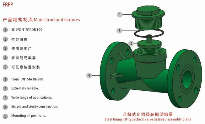 升降式塑料止回閥是指依靠介質(zhì)本身流動(dòng)而自動(dòng)開(kāi)、閉閥瓣,用來(lái)防止介質(zhì)倒流的閥門,又稱逆止閥、單向閥、逆流閥、和背壓閥。止回閥屬于一種自動(dòng)閥門,其主要作用是防止介質(zhì)倒流、防止泵及驅(qū)動(dòng)電動(dòng)機(jī)反轉(zhuǎn),以及容器介質(zhì)的泄放。止回閥還可用于給其中的壓力可能升至超過(guò)系統(tǒng)壓的輔助系統(tǒng)提供補(bǔ)給的管路上。止回閥主要可分為旋啟式止回閥(依重心旋轉(zhuǎn))與升降式止回閥(沿軸線移動(dòng))。止回閥的作用是只允許介質(zhì)向一個(gè)方向流動(dòng),而且阻止反向流動(dòng)。通常這種閥門是自動(dòng)工作的,在一個(gè)方向流動(dòng)的流體壓力作用下,閥瓣打開(kāi);流體反方向流動(dòng)時(shí),由流體壓力和閥瓣的自重合閥瓣作用于閥座,從而切斷流動(dòng)。 其中內(nèi)螺紋止回閥,蝶式止回閥就屬于這種類型的閥門,升降式塑料止回閥裝配明細(xì)圖: