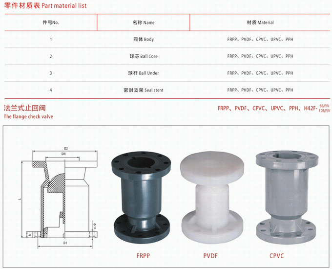 球芯式塑料止回閥零件材料與外形結(jié)構(gòu)圖: