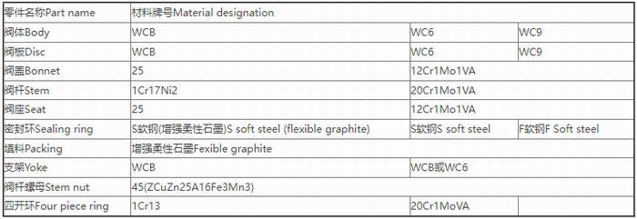 高溫高壓電動閘閥零件材料: