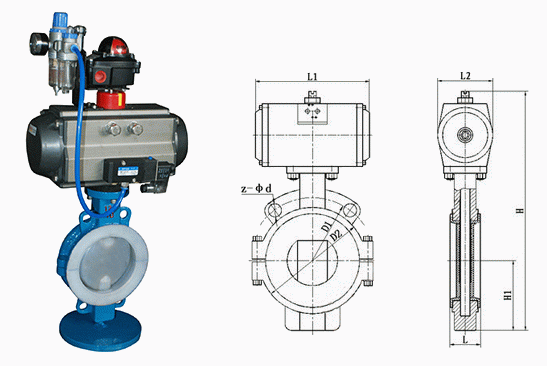 氣動(dòng)對(duì)夾式襯氟蝶閥外形結(jié)構(gòu)圖: