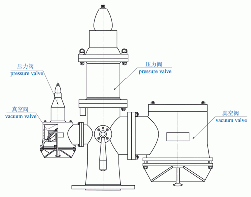 依據(jù)IMO和IBC規(guī)范,每只貨油艙需設(shè)兩套透氣裝置或一套透氣裝置加一套液貨壓力傳感器,以防止其中之一出現(xiàn)故障時(shí)也能確保艙內(nèi)不超壓或失壓。因此,經(jīng)認(rèn)可的各規(guī)格高速透氣閥,也可以將其中一個(gè)規(guī)格作為附件與主流量閥組合在一起。壓力設(shè)定成主流閥為正常工作壓力,附件閥為保險(xiǎn)壓力。這樣的透氣方式既可最大限度地防止貨油艙超壓或失壓。同時(shí),在裝載速率允許的情況下,也可以作為增大裝載速率的補(bǔ)助裝置,但這種透氣裝置成本較高。
