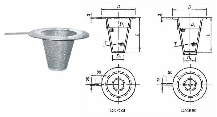 平頂錐形過濾器是一種為過濾石油化工生產過程中液體或氣體介質所含的固體顆粒,從而保證泵正常運行,滿足石油化工企業(yè)的安全生產需要而設置在泵入口管道上的臨時性使用的過濾器。其由濾框、濾網及法蘭等構成,濾框由不銹鋼或雙相不銹鋼冷軋鋼板沖制成具有分布均勻孔徑的孔板,并卷成外形為平底錐形狀,小頭一端用圓形沖孔板封底,另一頭焊裝有對夾式法蘭,具有一定目數規(guī)格的金屬編織絲網濾網設置在濾框的內表面或外表面上,當流體通過進口端法蘭進入過濾器后,其固體雜質被阻擋,而清潔的濾液卻能穿過濾網流入到管道另一端,進入下一道工序。本產品根據工況的不同一般有兩種流向,安裝在直管段位置時為左右流向,設置在彎頭處時為自上端流入下端。