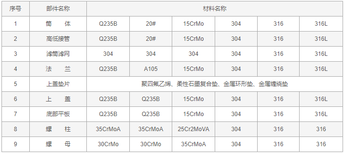 高低接管籃式過(guò)濾器零件材料: