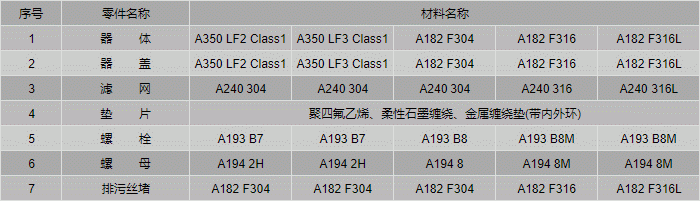 低溫Y型過濾器零件材料表: