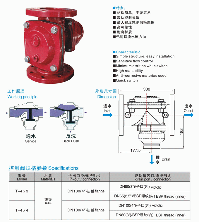 二位三通閥應(yīng)用于至少有兩個(gè)并列過(guò)濾單元的自動(dòng)反沖洗過(guò)濾系統(tǒng),即:在反沖洗過(guò)程中,經(jīng)一個(gè)過(guò)濾單元過(guò)濾后的潔凈水作為另外一個(gè)過(guò)濾單元的沖洗水。當(dāng)接受到控制器發(fā)出的水力信號(hào)后,反沖洗閥內(nèi)改變水流的流向:關(guān)閉進(jìn)水口,打開(kāi)排水口,經(jīng)其它過(guò)濾單元過(guò)濾后的潔凈水進(jìn)入此單元進(jìn)行沖洗,并將沖洗水經(jīng)排放口排放。