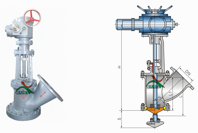電動平底放料閥有Y型及角式兩種結(jié)構(gòu)形式,根據(jù)實(shí)際工況的需要,放料口的形式設(shè)計有帶管接及平底兩種,閥體內(nèi)腔裝有耐沖刷、耐腐蝕的護(hù)板,在開啟閥門瞬間,可以保護(hù)閥體不被介質(zhì)沖刷、腐蝕,并對其整體進(jìn)行化學(xué)鍍Ni.P處理,使表面硬度達(dá)到HRC60—62,有耐磨、耐腐蝕的。閥座密封面與閥瓣密封面均堆焊有司太立硬質(zhì)合金,密封副采用線密封,保證密封,密封的可靠性,并可防止結(jié)疤。閥門設(shè)有防轉(zhuǎn)機(jī)構(gòu),保證閥桿在開啟和關(guān)閉時只做直線運(yùn)動,不做回轉(zhuǎn)運(yùn)動。該閥主要由閥體、閥瓣、密封圈、閥桿、支架、閥壓蓋、手輪、法蘭、螺母、定位螺釘?shù)攘慵M成。手輪順時針旋轉(zhuǎn),閥門關(guān)閉,閥桿向上移動,此閥為上展式。手輪順時針旋轉(zhuǎn),閥門關(guān)閉,閥桿向下轉(zhuǎn)動,此閥為下展式。閥門驅(qū)動方式有:手動、電動、氣動、齒輪傳動。