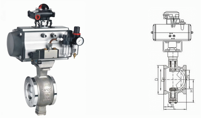 對(duì)夾式氣動(dòng)V型切斷球閥外形結(jié)構(gòu)圖: