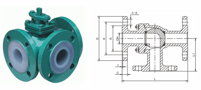襯氟L型三通球閥外形結(jié)構(gòu)圖: