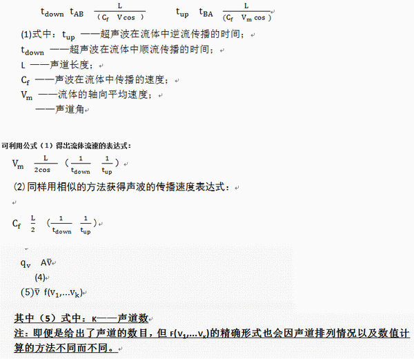 流量計以測量聲波在流動介質(zhì)中傳播的時間與流量的關(guān)系為原理。通常認(rèn)為聲波在流體中的實際傳播速度是由介質(zhì)靜止?fàn)顟B(tài)下聲波的傳播速度和流體軸向平均流速在聲波傳播方向上的分量組成。如下示意圖所示,順流和逆流傳播時間與各量之間的關(guān)系是: