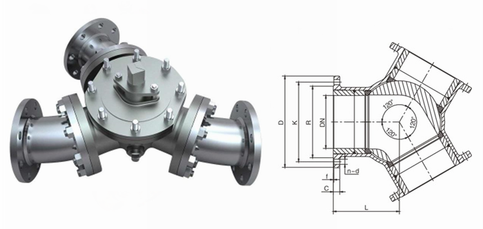 120度三通Y型球閥外形結(jié)構(gòu)圖:
